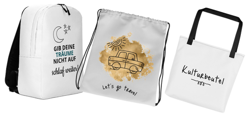 Hier findest du eine Auswahl an Beuteln und Rucksäcken. Unsere Designs sind praktisch und stylisch zugleich – perfekt für den Alltag und unterwegs!